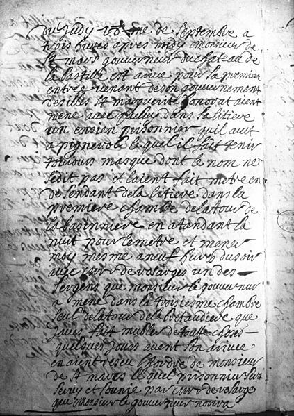 Uwięzienie Człowieka w żelaznej masce, jak odnotowano w rejestrze więziennym Bastylii w dniu 18 września 1698 r.
