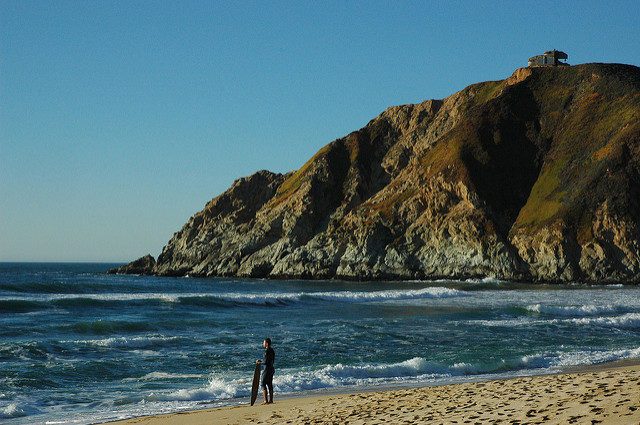 Surfer stojący na plaży z bunkrem Devil’s Slide w prawym górnym rogu – Autor: Wonderlane – CC BY 2.0