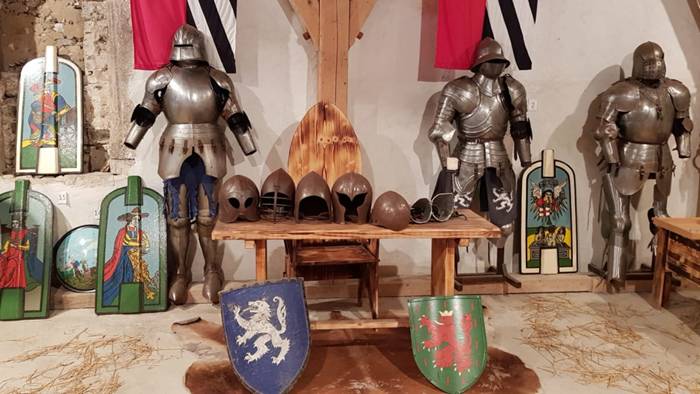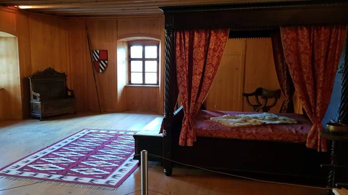 Kolejne drzwi łączą salę sądową z jadalnią, chronione przed światem zewnętrznym murami o grubości około 1,7 metra. Pomieszczenie to było połączone z kuchnią i ogrzewane było małym paleniskiem, a szczelina nad nim służyła jako naturalny wyciąg. Wspinając się na wyższe piętra, goście mogą obserwować wycięcia w ścianach i podłodze dla broni obronnej oraz dziury, przez które strumienie wrzącego oleju i stopionej żywicy spływały na napastników. Dodatkowo na tym poziomie znajduje się taras z pięknym widokiem na dolinę oraz najsłynniejsza toaleta w historii Słowenii. Z głównej sypialni jest również wyjście na taras: to najcieplejsze pomieszczenie w całym zamku, ogrzewane własnym kominkiem.
